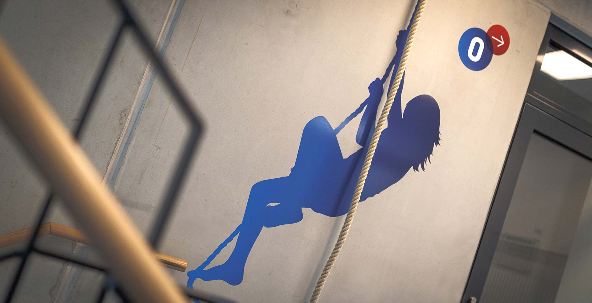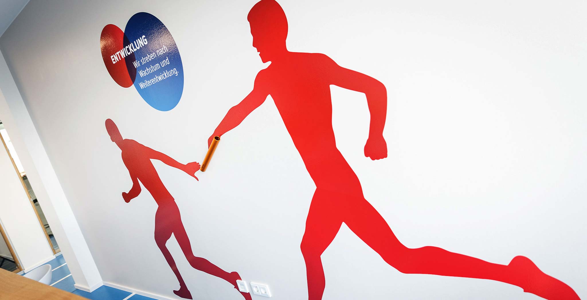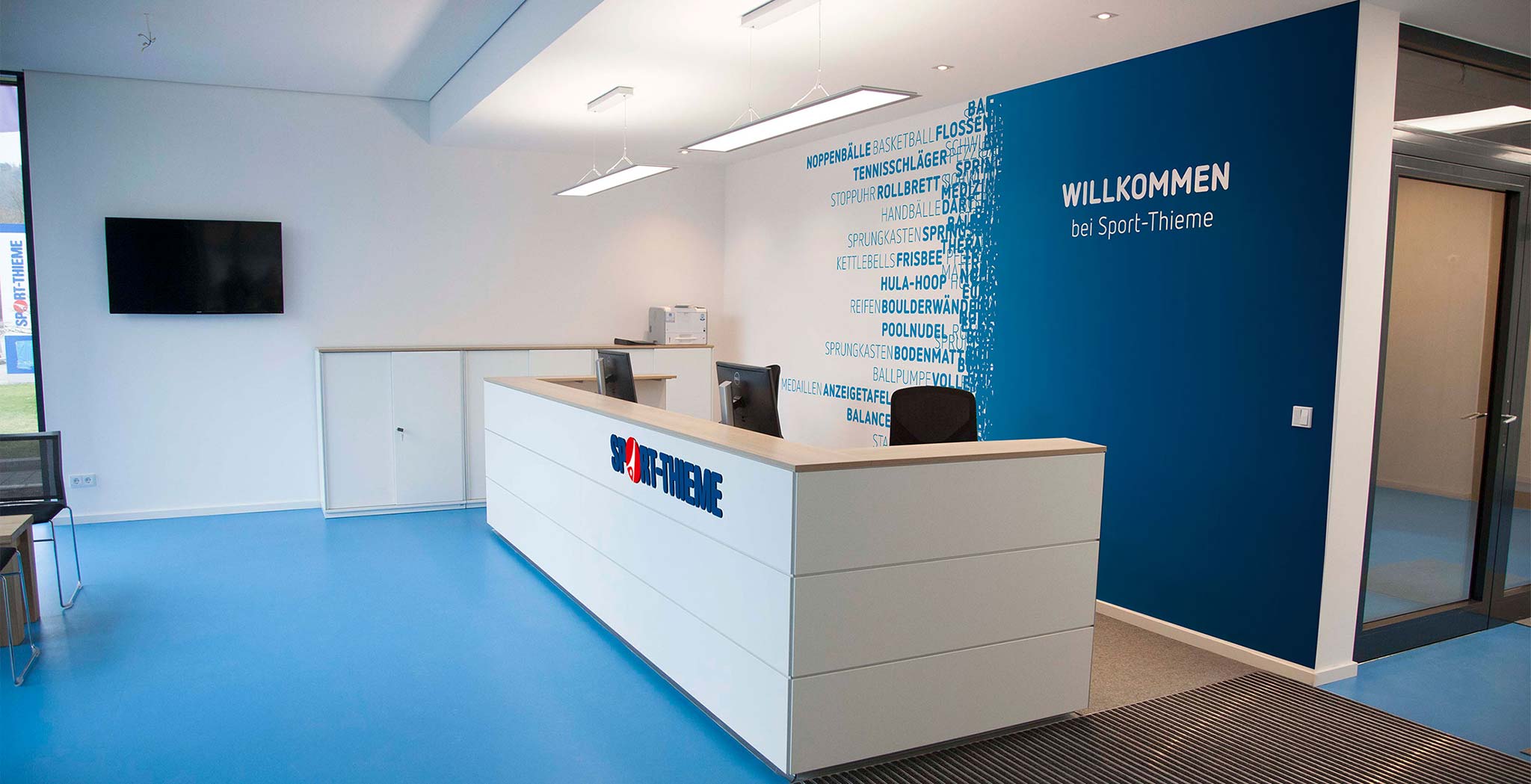 The core of the new office design concept is the combination of the Sport-Thieme brand values with outlined figures of athletes and genuine sports equipment. A new, unique typeface along with the red and blue brand colours are implemented consistently within the building.
